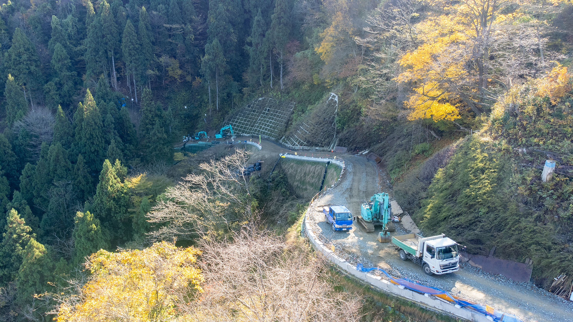 森林整備や木材の搬出などに利用される道を整備する工事です。 林道工事の種類には、林道を開設する新設工事、既存の林道の機能強化を行う改良工事、豪雨等により被災した林道の機能を復旧する災害復旧工事があります。